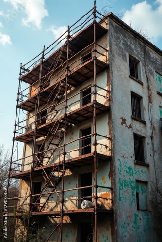 Rusting scaffolding clings to a derelict apartment building , building, hollow, demolition