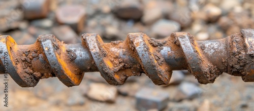 Rusty auger bit close-up, construction site debris background