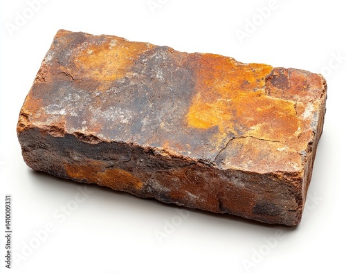 Rusty Brown Rectangular Brick Close Up with Speckled White Detail on White Background