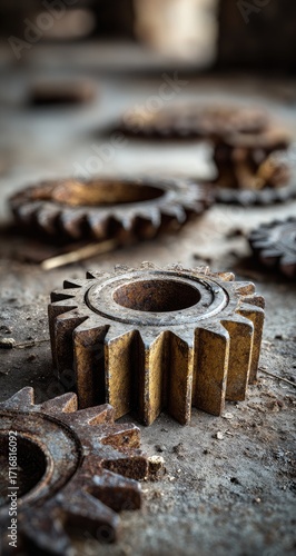 Rusty gears scattered factory floor, industrial background