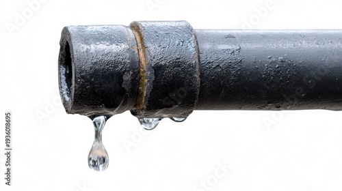 Rusty leaking pipe with water droplets on white background