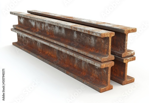 Rusty Metal Beams Stacked on a White Background with Textured Surface and Visible Corrosion, Industrial Material for Construction or Engineering Projects