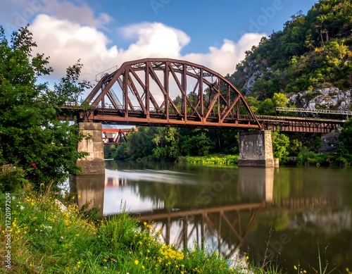 Rusty metal railroad bridge over a river