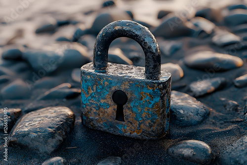 Rusty padlock on beach rocks
