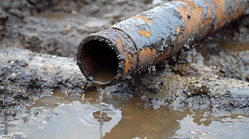 Rusty pipe leaking dirty water in mud.