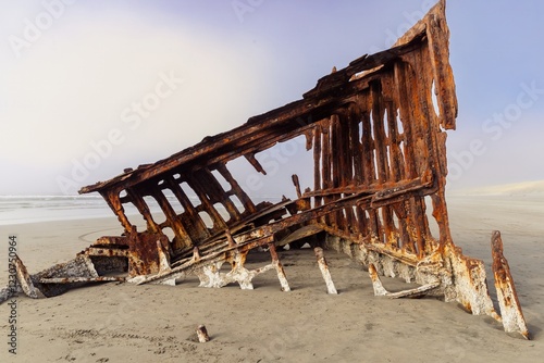 Rusty shipwreck wreckage on a beach. Nature's reclamation of a lost vessel. Wreck Of The Peter Iredale, Fort Stevens State Park, Oregon, USA