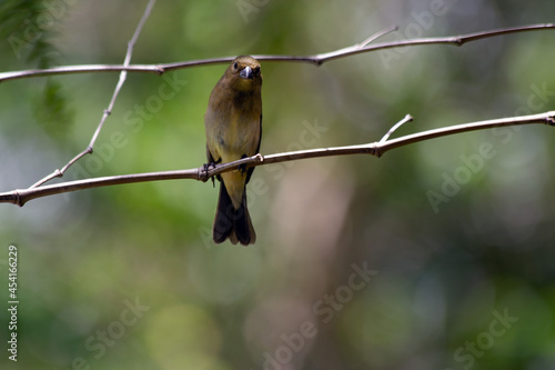 Rusty-collared Seedeater also know Marsh Collar or Coleiro-do-brejo. A beautiful brown bird perched on bamboo tree. Species Sporophila sp. Animal life. Birdwatcher.