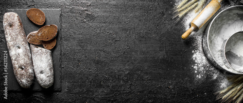 Rye bread with flour and rolling pin.