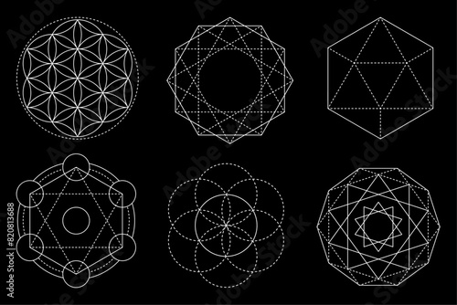 Sacred geometry vector design elements. Alchemy, religion, philosophy, spirituality, hipster symbols and elements isolated on black background. Vector illustration