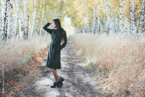 Sad beautiful girl with long natural black hair on bokeh background of autumn yellow leaves. Depressed girl in fall forest. Autumn apathy. Female emotional gloomy portrait in full growth. Faded tones.