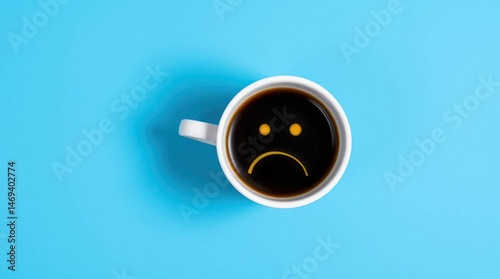 Sad face formed in coffee inside a white mug on a blue background