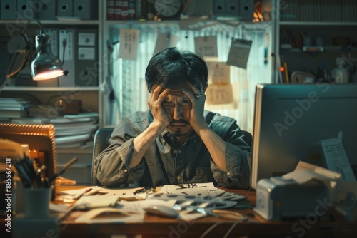 Sad office worker, tired manager, sad person, having bad day, overworked burnout, a lot of paperwork