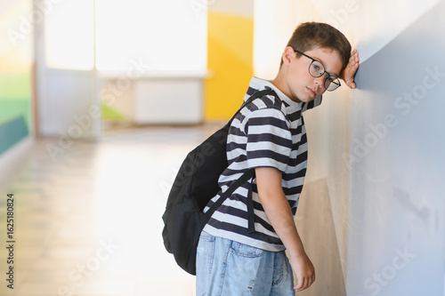 Sad schoolboy crying leaning against wall at school after bullying from classmates