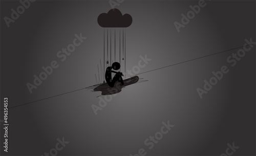 Sad stick person sitting under dark raining cloud above head, in dark place concept of sadness, sad Joe, copy space