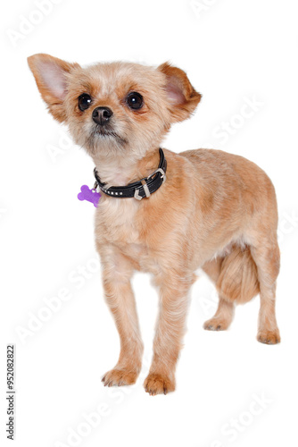 Sad yorkshireterrier puppy dog standing, taken on a white background