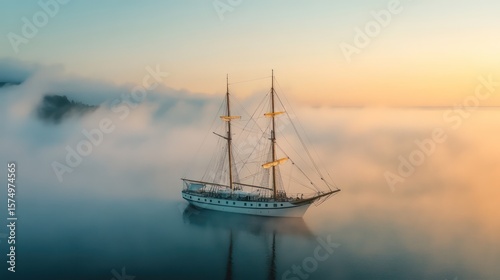 Sailboat Emerging from Misty Waters at Sunrise with Golden Hues and Reflections