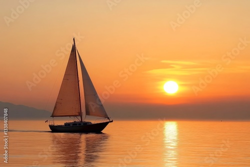 Sailboat glides across calm waters during a vibrant sunset with golden hues illuminating the sky