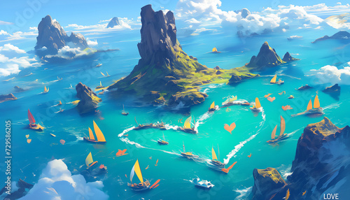 Sailboats and Heart Shapes on a Tropical Island Sea