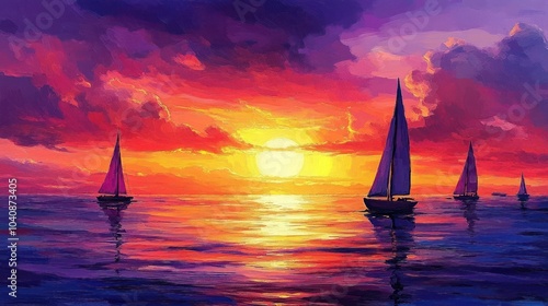 Sailboats on a calm sea at sunset.