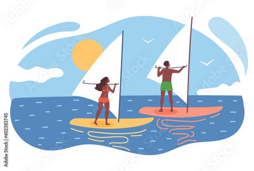 Sailing, a man and a woman ride boards with a sail. An African American couple is engaged in water sports.