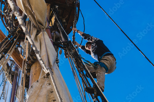 Sailors work with sails at a height on a traditional sailboat
