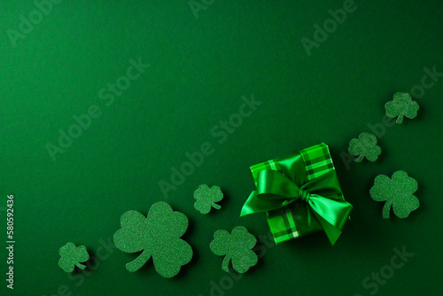 Saint Patrick day concept flat lay with green gift box close up on yellow background,