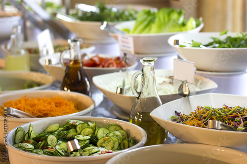 Salad bar in the hotel. Fresh cucumber, carrots and olive oi