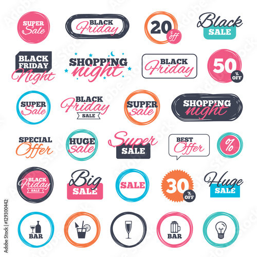 Sale shopping stickers and banners. Bar or Pub icons. Glass of beer and champagne signs. Alcohol drinks and cocktail symbols. Website badges. Black friday. Vector