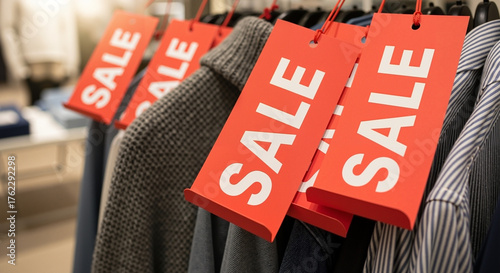 Sale tags hanging on clothing in retail shop during discount season
