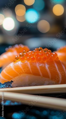 Salmon nigiri sushi topped with vibrant orange roe on plate with chopsticks