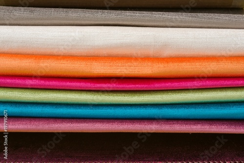 Samples of colorful interior fabrics. Book of fabrics for curtains, upholstery