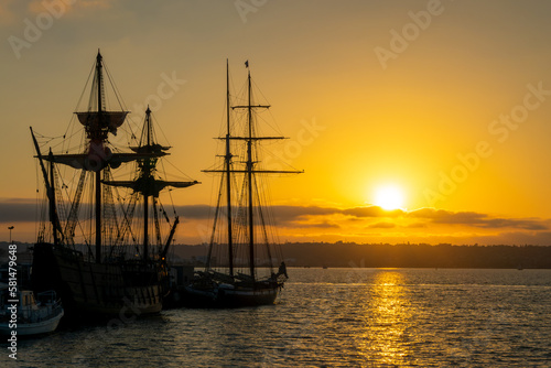 San Salvador historic sailing ship in San Diego maritime museum at sunset, California