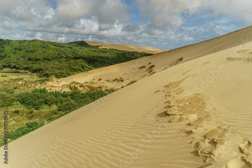 sand dune with footprints under cloudy sky, Giant Sand Dunes, New Zealand