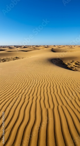 Sand dunes stretch across a desert landscape under a clear blue sky.