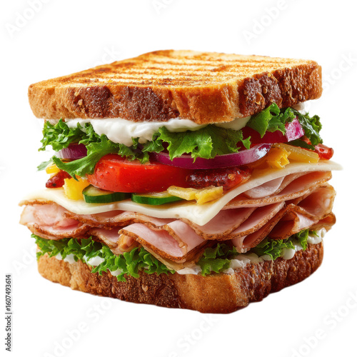 Sandwich with many ingredients including ham, cheese, and lettuce