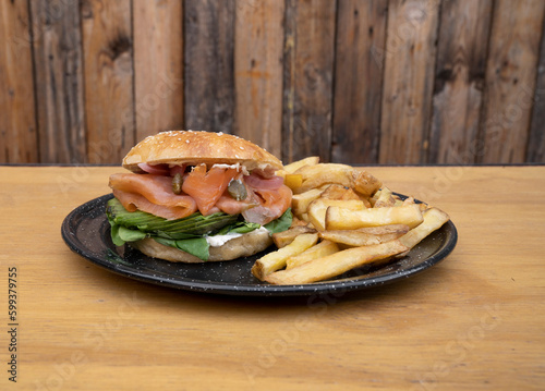 Sandwiches. Closeup view of smoked salmon bagel with cream cheese, sliced avocado, capers, onion, arugula and fried potatoes, in a black dish on the restaurant wooden table.