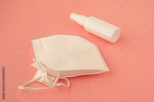 Sanitizing antibacterial spray in white bottle and protective mask for infection prevention.