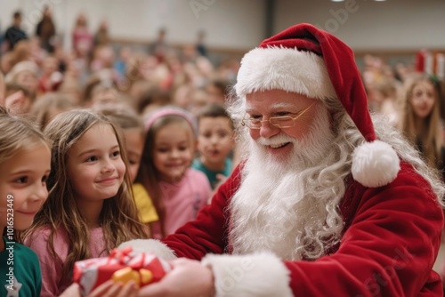 Santa Claus Gives Gifts to Excited Children at Festive Christmas Gathering, Joyful Celebration, Holiday Cheer, Christmas Spirit, Kids, Presents, Santa, Christmas Party, Christmas Eve, Christmas