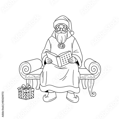 "Santa Claus Sitting and Reading a Book with Gifts – Christmas Character Outline Vector Art"