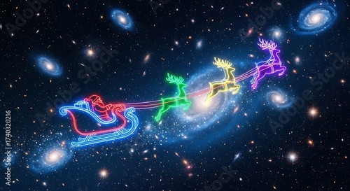 Santa Claus Sleigh with Neon Reindeer Flying in Space Galaxy