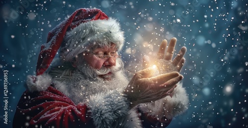 Santa Claus with gifts for children walking on winter street with blurred house on a night of Christmas Eve. Man in santa claus costume. Merry Christmas and happy New Year concept