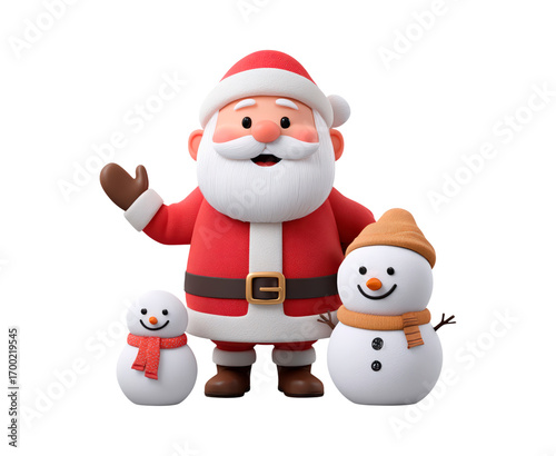 Santa claus with snowmen in festive christmas scene on transparent background, PNG