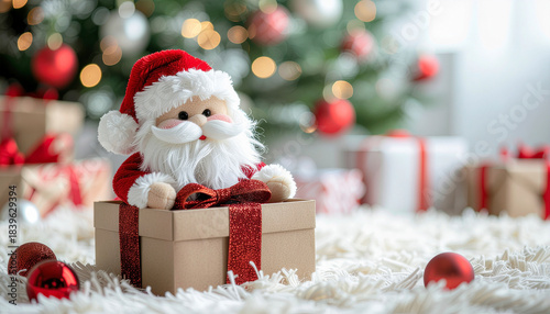 Santa Doll Riding on Gift Box — Playful Christmas Decoration Photography
