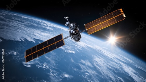 Satellite Orbiting Earth Solar Panels Spacecraft Sunrise Technology Exploration