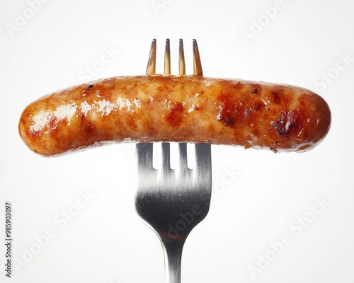 Sausage on fork isolated on white background.