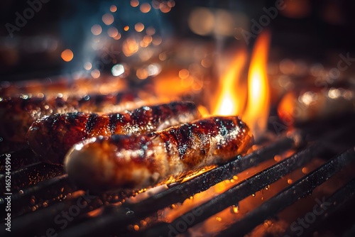 Sausages sizzling on a grill, flames flickering, warm evening light.
