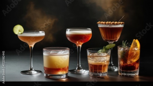 Savor sophisticated cocktails in elegant glassware, perfect for upscale bars, restaurant promotions, or festive celebrations, evoking luxury and enjoyment.
