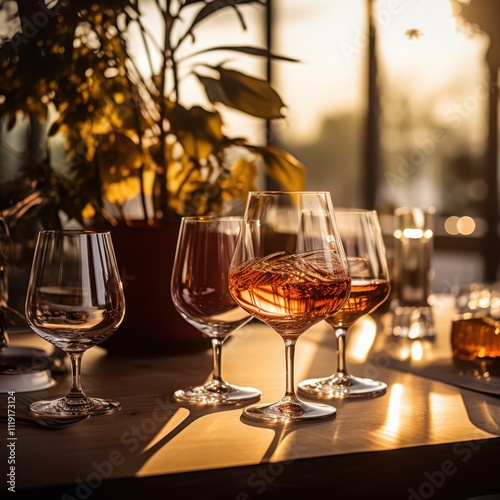 Savoring amber spirits at golden hour elegant crystal glasses warm wooden backdrop minimalist setting