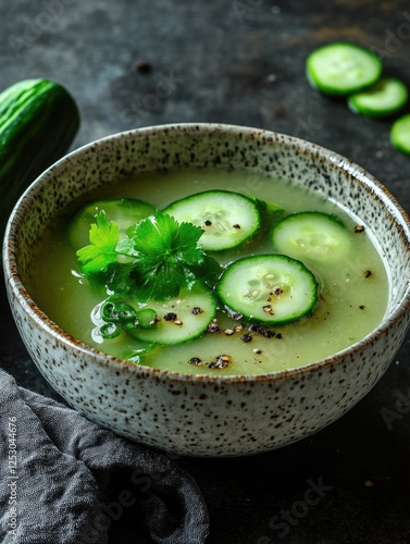 Savory, healthy cucumber soup with herbs and pepper on top of a textured bowl, served in kitchen setting.