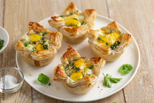savory puff pastry cups with egg and cheese
